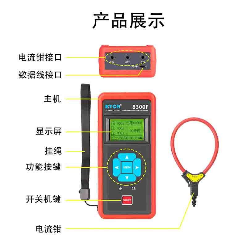 ETCR8300F三通道柔性线圈电流记录仪主机采用蓝屏LCD显示,三通道同屏显示,一目了然,有中文操作界面和英文操作界面两款选择,适合于不同国家的工程技术人员。记录仪采用大容量可充电锂电池,续航*多可以持续记录7天。具有系统时钟功能和超大存储空间,能现场设定监测记录时间,能存储20万组数据,具有自动存储间隔时间设定功能,记录周期从1秒~99分钟内设置。配有USB通信接口数据上传软件具有历史数据读取、查阅、保存、报表等功能。