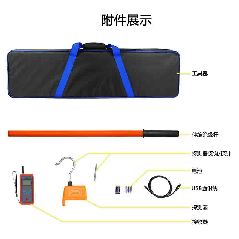 ETCR1800A无线高压验电器由接收器、探测器、伸缩绝缘杆、数据上传软件、USB通讯线等组成,测试时只需用绝缘杆把探测器挂在裸导线上,通过无线信号传输即可在手持接收器上读取电压值,一目了然非常直观,操作非常方便。无线信号直线传输距离约30米,探测器有红色LED和蜂鸣器等声光报警,使测试更简单轻松。通过USB通讯接口和上位机软件存储数据上传电脑具有历史数据查询、保存、打印等功能。