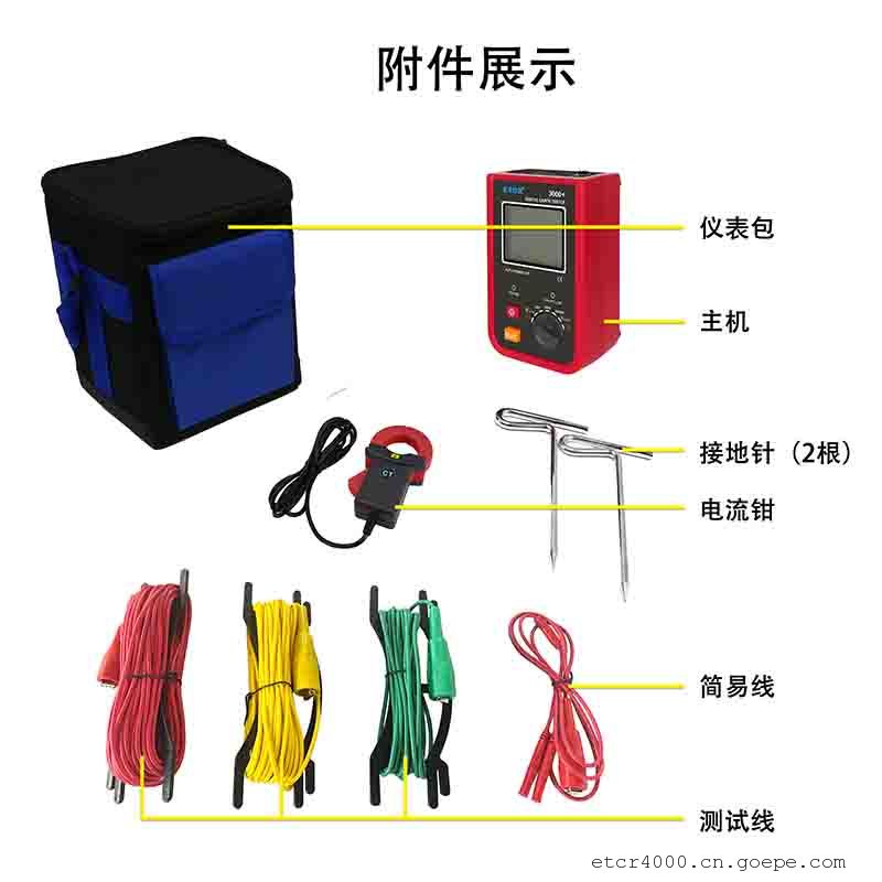 ETCR3000A+ 数字式接地电阻测试仪由主机、电流钳、测试线等组成。仪表具有辅助接地桩接地电阻判断功能,仪表在测试时能显示辅助接地桩的阻值,能避免辅助接地极接地电阻过大引起的误差。具有线阻校验功能,能避免因测试线未完全插入仪表接口或接触不良引起的误差及因用户更换或加长测试线引起的误差。使得现场低值接地电阻测量更准确可靠。