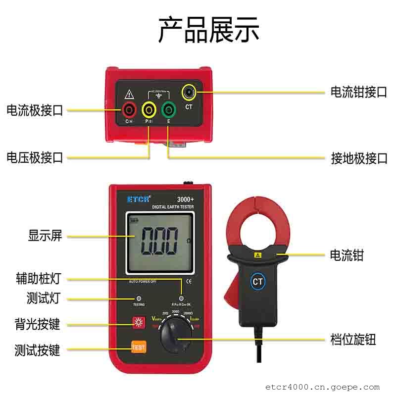 详细信息| 询价留言品牌:ETCR 型号:ETCR3000+ 加工定制:是 测试电阻:0.10Ω~2000Ω 测试精度:0.01Ω 外形尺寸:仪表尺寸:160×100×66 mm ETCR3000+ 数字式接地电阻测试仪又称接地电阻表、数字接地电阻表、地桩式接地电阻仪、接地摇表,用于接地电阻测量、接地电压测量、接地电流测量,仪表采用数字及微处理技术,精密3线法或2线法测量接地电阻。仪表配有电流钳可测试接地线的漏电流,检测接地线故障。其广泛应用于电力、电信、气象、油田、建筑、防雷及工业电气设备等行业。