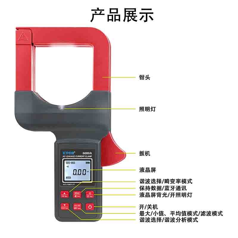 ETCR6680钳形漏电流表可测试40Hz~1kHz频率范围的电流。钳表还具有背光、手电筒、数据存储、蓝牙通讯等功能。钳表使用大容量锂电池type-c充电口,是一款新型的电工安全检测必备工具。