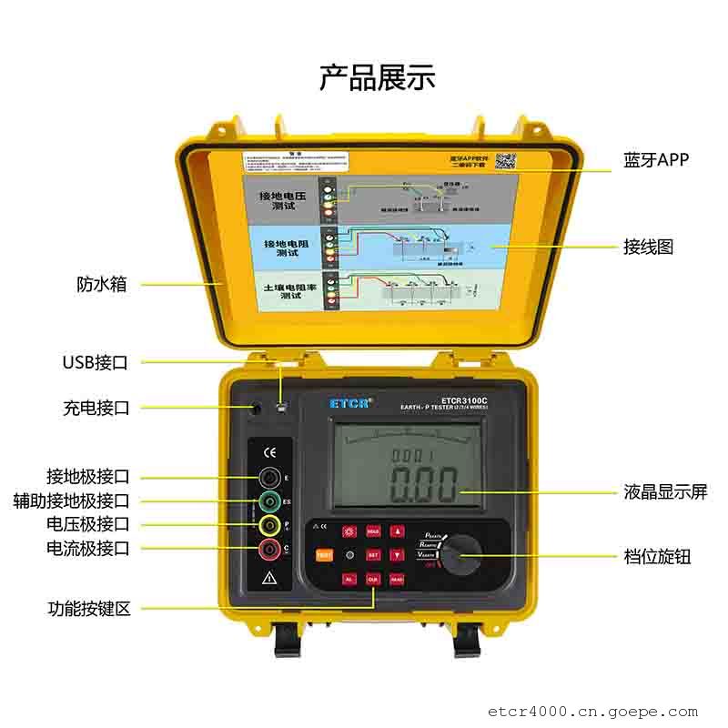 ETCR3100C接地电阻/土壤电阻率测试仪由主机、数据上传软件、测试线、辅助接地棒、通讯线等组成。仪表外壳采用防水保护箱,防撞、防摔、防水(防护等级IP65)坚固安全耐用,仪表还配有大容量可充电锂电池组,特别适合在户外工地使用。主机超大LCD显示,白屏背光,棒图指示,一目了然。蓝牙通讯功能,数据存储功能存储300组数据,通过USB接口数据上传软件实现历史查询与在线实时监测功能,动态显示,告警指示,具有历史数据读取、查阅、保存、报表、打印等功能。