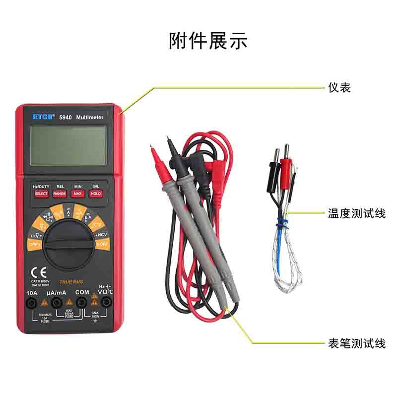 详细信息| 询价留言品牌:ETCR 型号:ETCR5940 加工定制:是 测试电阻:0.0Ω~60MΩ 电压量程:DC 0mV~1000V;AC 0mV~1000V 电流量程:DC 0.0uA~10A;AC 0.0uA~10A 电容量程:0.000nF~9.999mF 频率量程:0.000Hz~20MHz 温度量程:0℃~1000℃ -