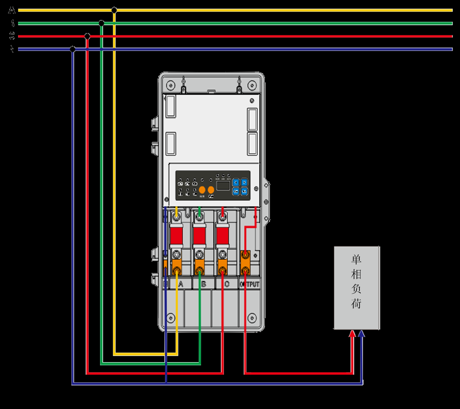 装置具有手动换相和自动换相两种换相模式。手动换相模式:用户可手动将负载切换至A、B、C任一相供电,以满足用户特殊情况的需求。自动换相模式:装置自动将负载从低压相切换到高压相,确保负载正常工作。