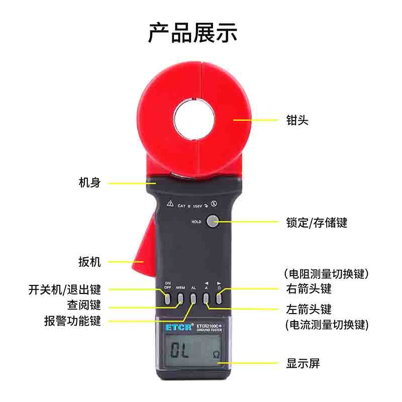 ETCR2100C+能测量出用传统方法无法测量的接地故障,能应用于传统方法无法测量的场合,因为钳形接地电阻仪测量的是接地体电阻和接地引线电阻的综合值。